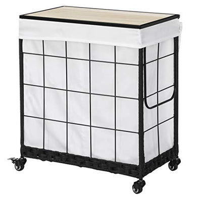 Laundry Hamper with Wood Lid and Divided Liner Bag;Durable Laundry Basket with Heavy Duty Rolling Lockable Wheels; Laundry Sorter with Removable Liner Bag (White)