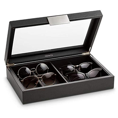 Glenor Co Sunglasses Organizer Case - 8 Slot Storage Holder to Display Sunglass/Eye Glasses - Modern Box with Clear Glass Top and Metal Buckle for Men and Women - Carbon Fiber Leather Design - Black