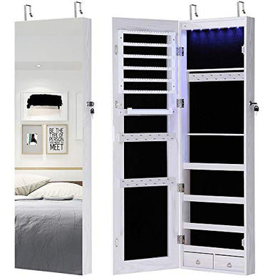 GISSAR Full Length Mirror Jewelry Cabinet, 6 LEDs Jewelry Armoire Wall Mounted Over The Door Hanging, Jewelry Organizer Storage with Lights Lockable White