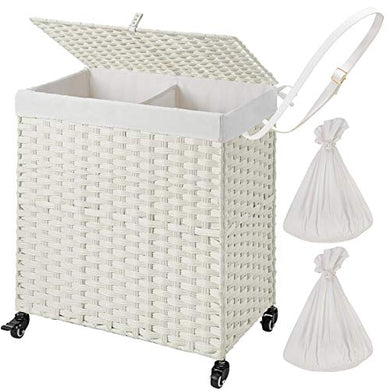 Greenstell Laundry Hamper with Wheels & 2 Removable Liner Bags, Divided Handwoven Hampers, Synthetic Rattan Clothes Laundry Basket with Lid & Handles, Foldable & Easy to Install White 22x12x26.4 in