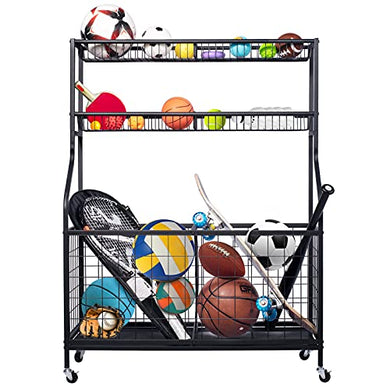 Garage Sports Equipment Organizer, Balls Storage Rack, Garage Storage Sports Rack, Garage Balls Storage, Sport Gear Garage Storage Rack with Baskets for Balls, Rackets, Workout Gear, Yoga Mats,Toys